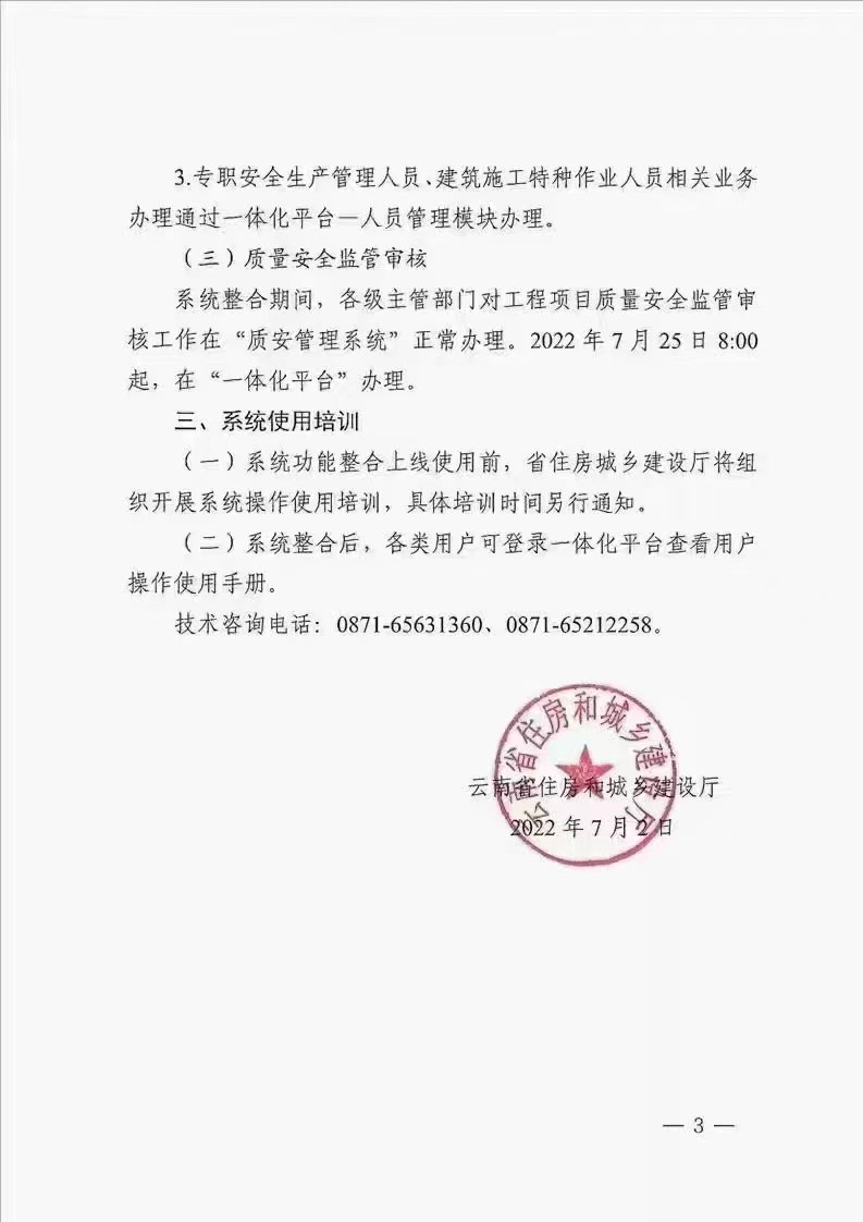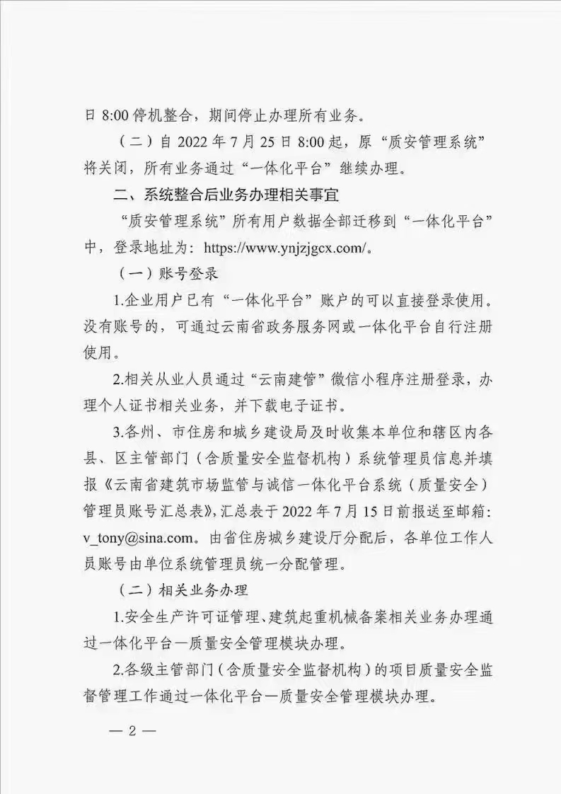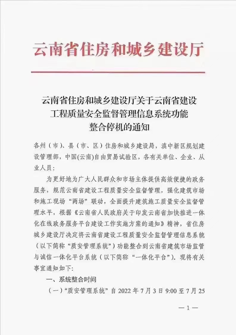 云南省住房和城鄉(xiāng)建設(shè)廳關(guān)于云南省建設(shè)工程質(zhì)量安全監(jiān)督管理信息系統(tǒng)功能整合停機(jī)的通知