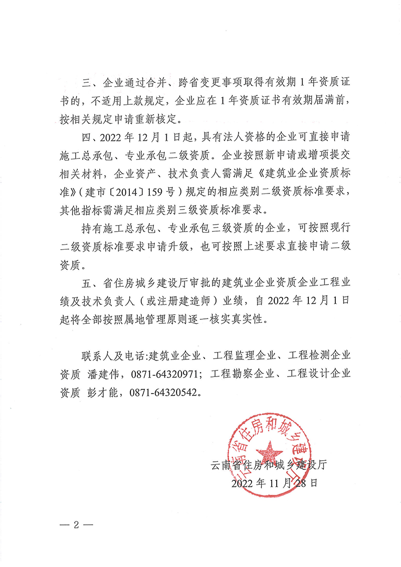 【最新文件通知】建筑業企業資質統一延期至2023年12月31日,2022年12月1日起,具有法人資格的企業可直接申請施工總承包貳級資質、專業承包貳級資質。持有施工總承包專業承包三級資質的企業,可按照現行二級資質標準要求申請升級,也可以按照上述要求直接申請二級資質。